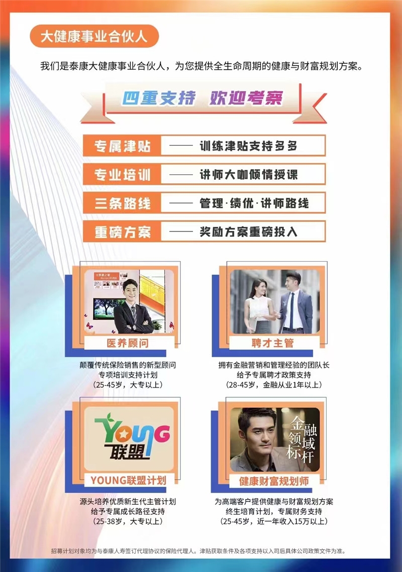 泰康养老保险股份有限公司成立于2007年8月10日,注册资本40 亿元 ,在全国设立了34家分公司及2家企业年金中心。泰康养老产品线全面对接国家医养三支柱,致力于为广大雇主和雇员提供企业/职业年金、团体寿险、团体意外险、团体及个人健康保险、团体及个人养老保险、个人税优健康保险等一揽子福利医养解决方案。努力成为新时代大民生工程的核心骨干企业。