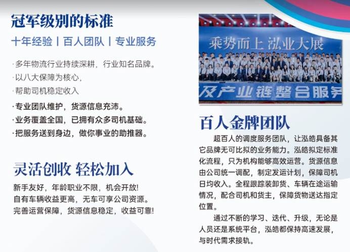 超百人的调度服务团队,让泓皓具备其它品牌无可比拟的业务能力。泓皓拟定标准化流程,只为机构能够高效运营。货源信息由公司统一调配,制定发运计划,保障司机日均收入。全程跟踪装卸货、车辆在途运输情况,配合司机和货主,保障货物送达指定 位置。
