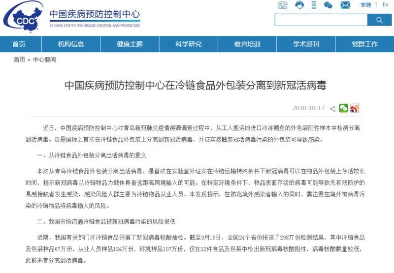 中国疾病预防控制中心官网发布消息称在冷链食品外包装分离到新冠活病毒