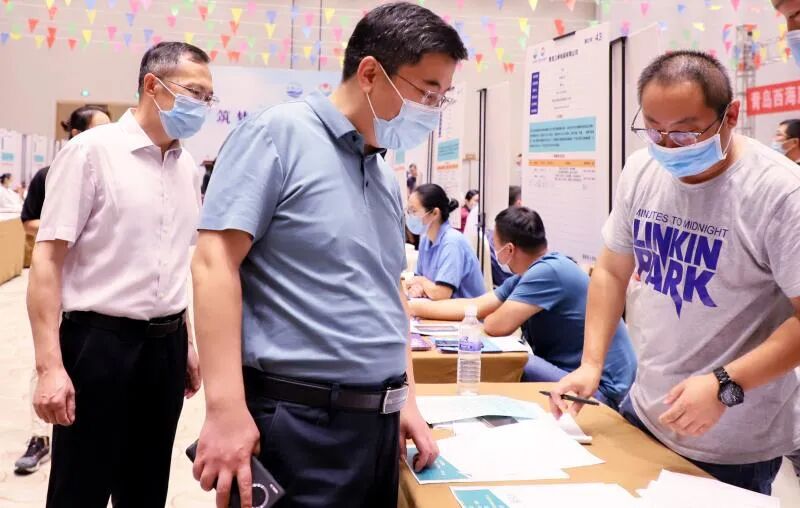 青岛海洋高新区和隐珠街道领导关心关切招聘成效,到招聘展台前与企业和求职者深入交流。