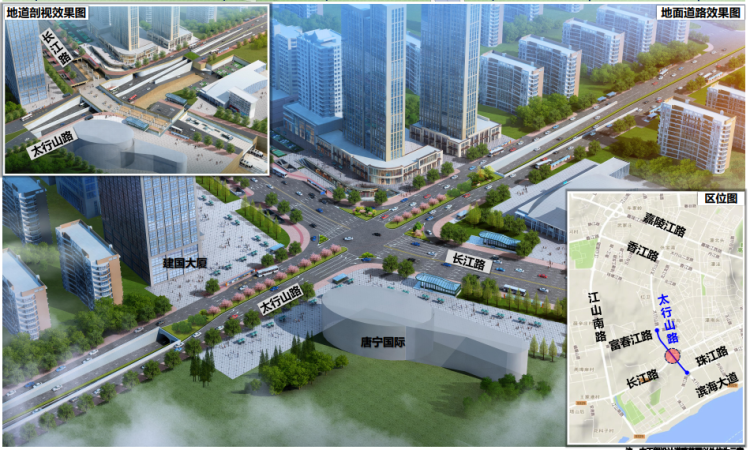 与长江路交叉口处,太行山路主线采用地下道路形式下穿长江路,两侧地面辅路与长江路平交。地下道路全长570m,暗埋段260m,敞口段310m。结合地道实施,同步完善人行过街设施。工程内容包含:道路、结构、管线、交通、照明、景观等工程。